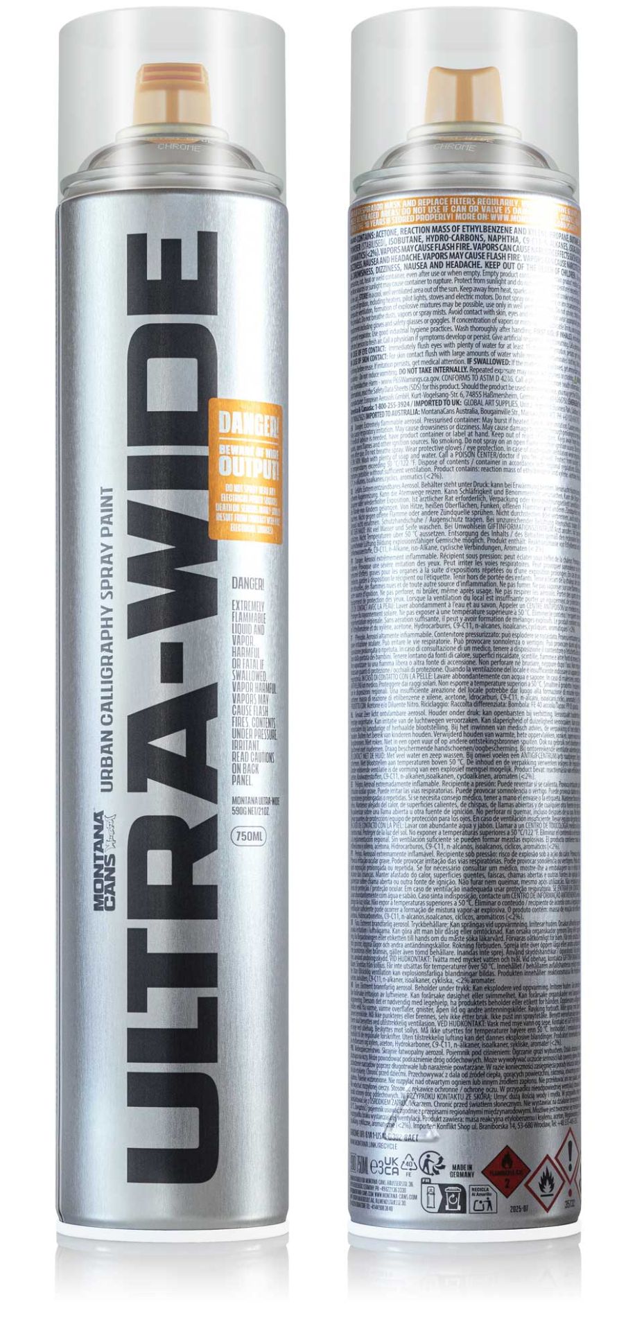 Montana Cans es el envase ULTRA-WIDE de 750 ml. Ideal para caligrafía urbana contemporánea y trazos ultraanchos, este envase ULTRA-WIDE está disponible en cromo, negro, rojo, azul, morado real y nappies, con un ancho de pulverización que varía desde 15 cm si se aplica rápidamente a corta distancia, hasta aproximadamente 60 cm si se aplica más despacio a mayor distancia de la superficie deseada.