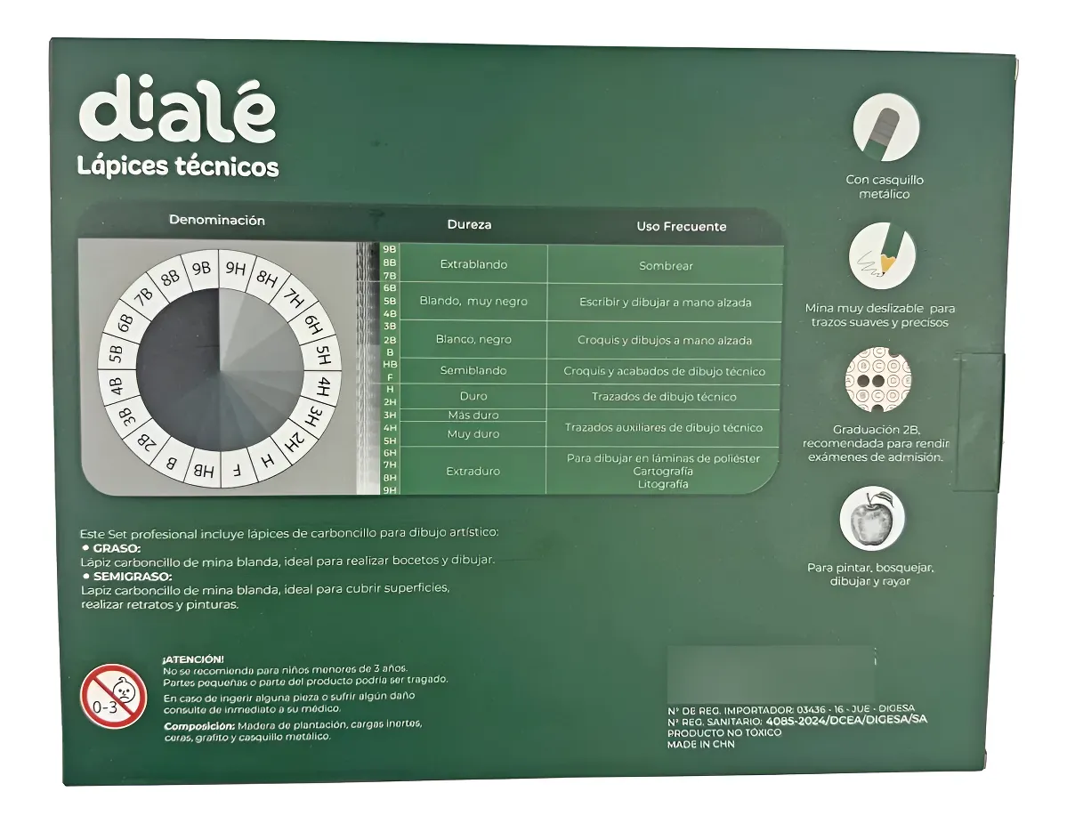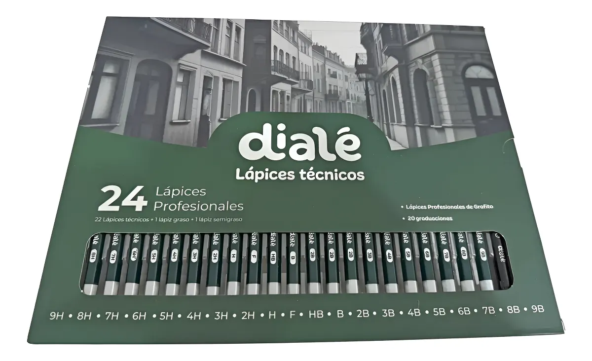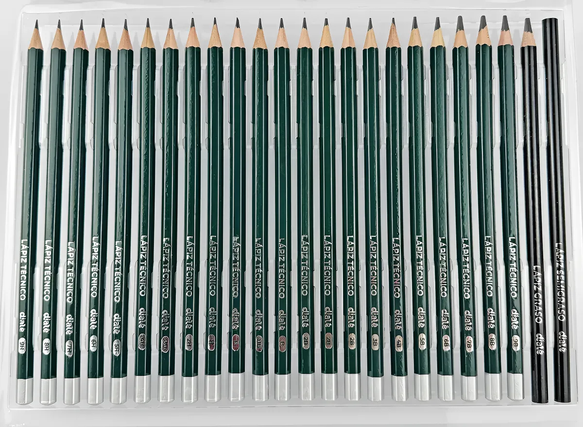 Descubre la precisión y versatilidad que ofrece el Set de 24 Lápices Grafito Profesionales de Dialé. Diseñados para artistas, diseñadores gráficos y estudiantes, estos lápices cubren una amplia gama de graduaciones, desde 9H para líneas finas y detalladas, hasta 9B para sombreados intensos y efectos dramáticos.