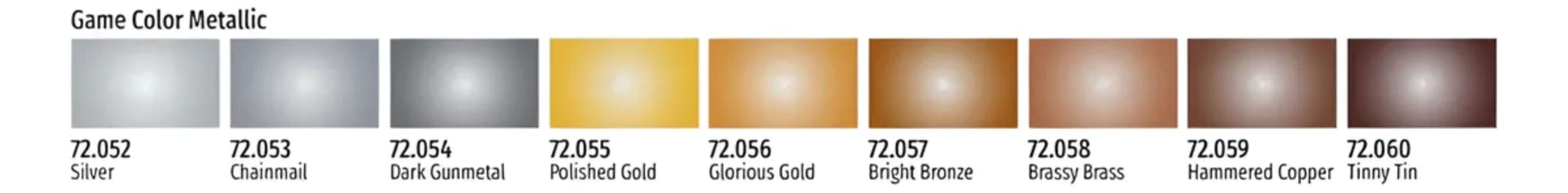 72.052 Silver, 72.053 Chainmail, 72.054 Dark Gunmetal, 72.055 Polished Gold, 72.056 Glorious Gold, 72.057 Bright Bronze, 72.058 Brassy Brass, 72.059 Hammered Copper, 72.060 Tinny Tin